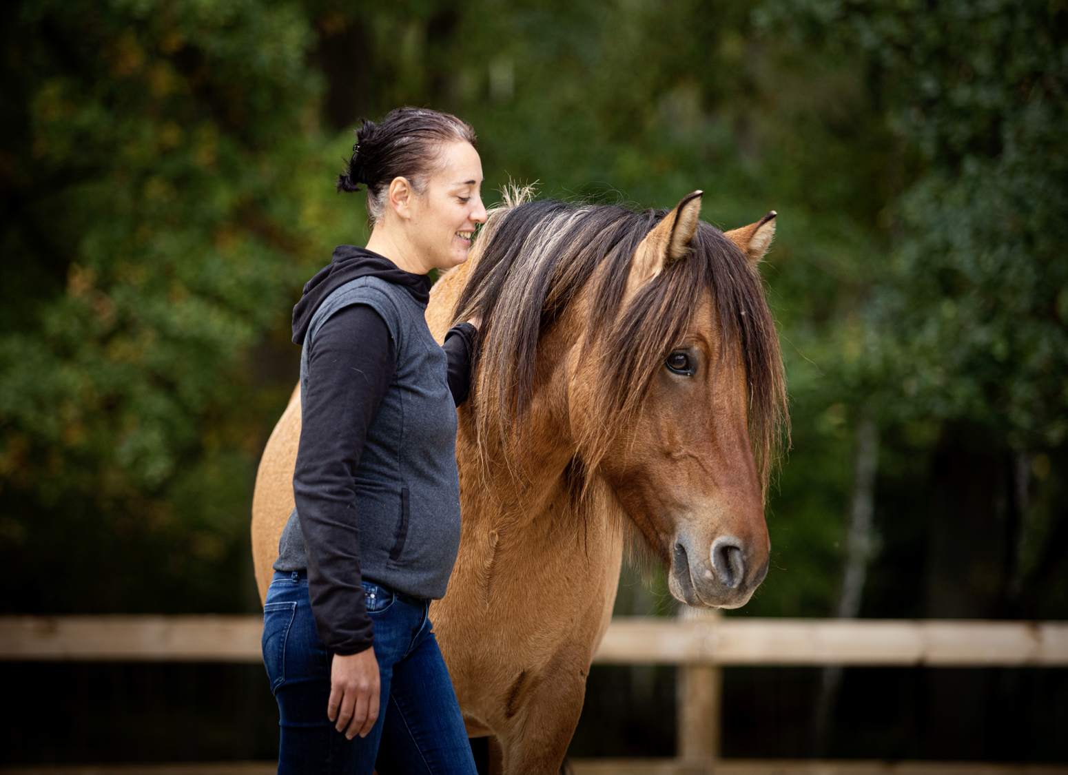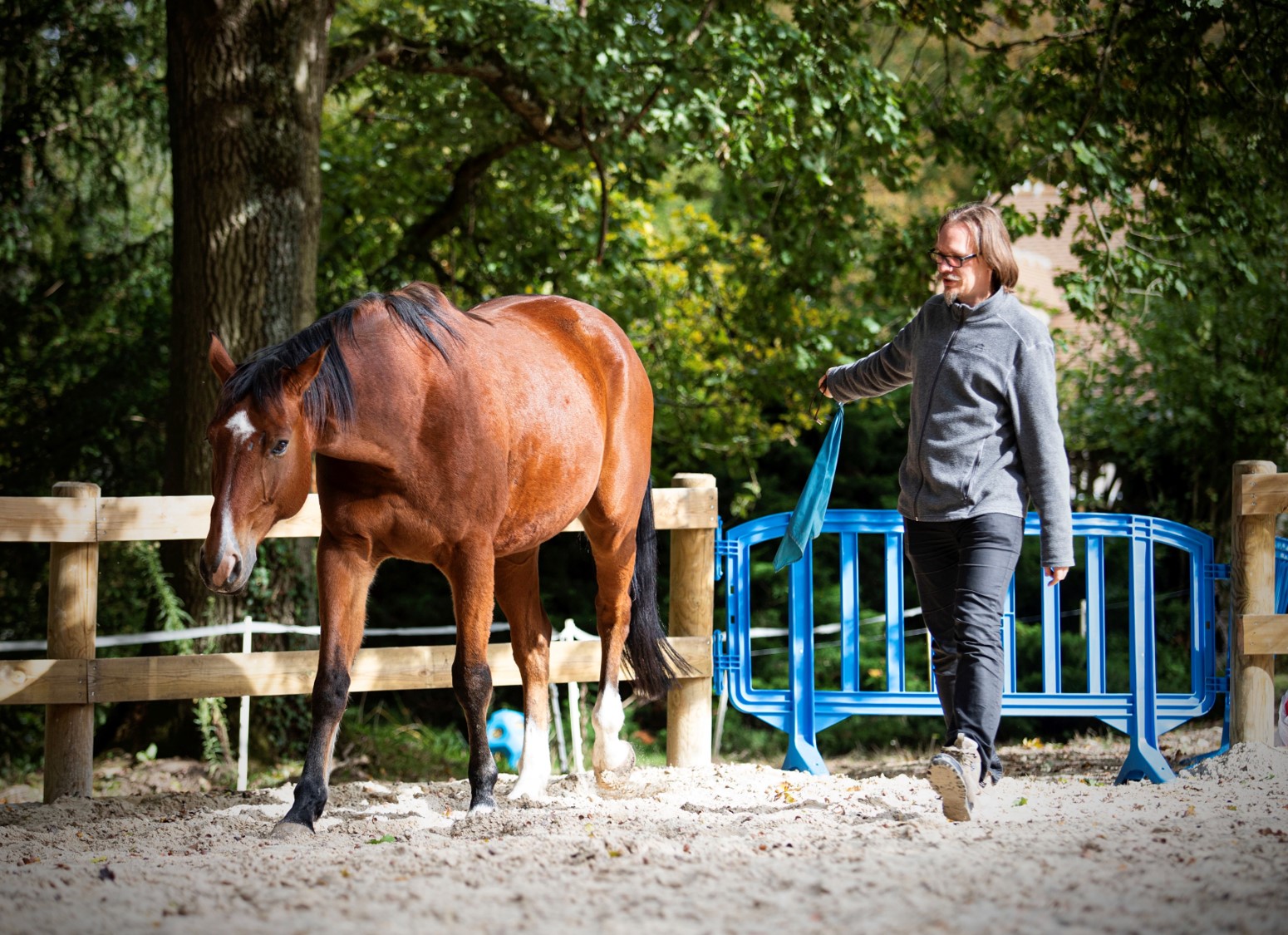 Avec Esprit d’équi, on ne monte pas à cheval, on travaille à côté du cheval et on utilise sa réponse comportementale pour se découvrir et apprendre à mieux communiquer, convaincre, négocier.